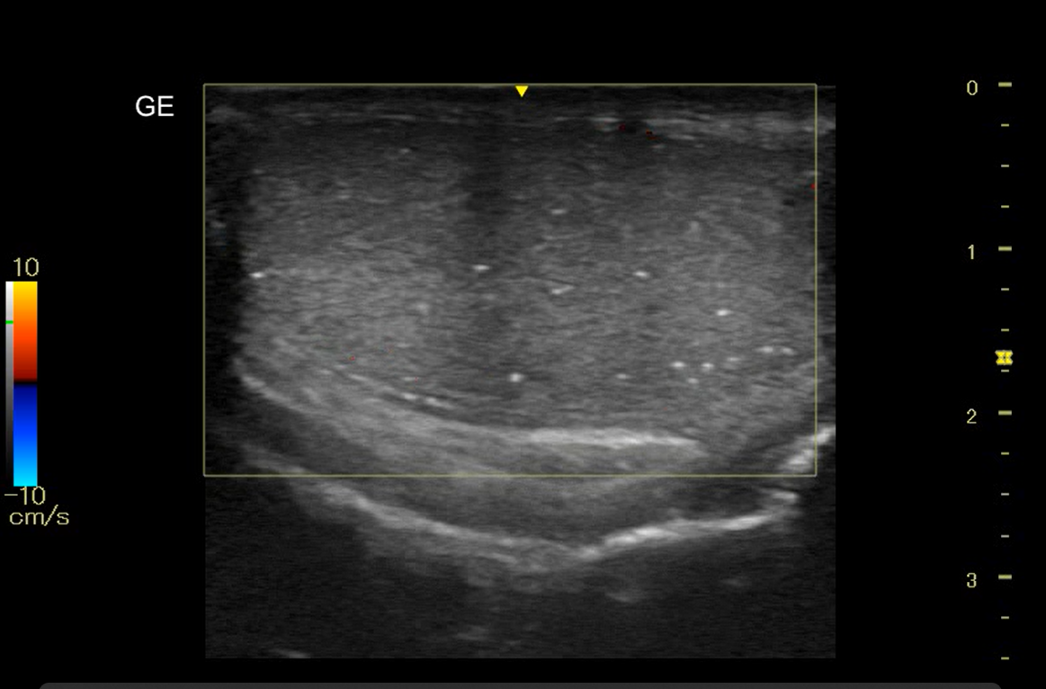 Inicia tratamiento con cefuroxima 500 mg cada 12 horas, se solicita analítica completa con marcador HCG tumoral y LDH normales, serología hepatitis, sida y sífilis negativa, transaminitis, hemograma normal, cultivo orina positivo a Pseudomonas auriginosa. Ecografía testicular reglada testicular preferente que es realizada al mes con mejoría de orquiepidimitis y confirma microlitiasis testiculares.