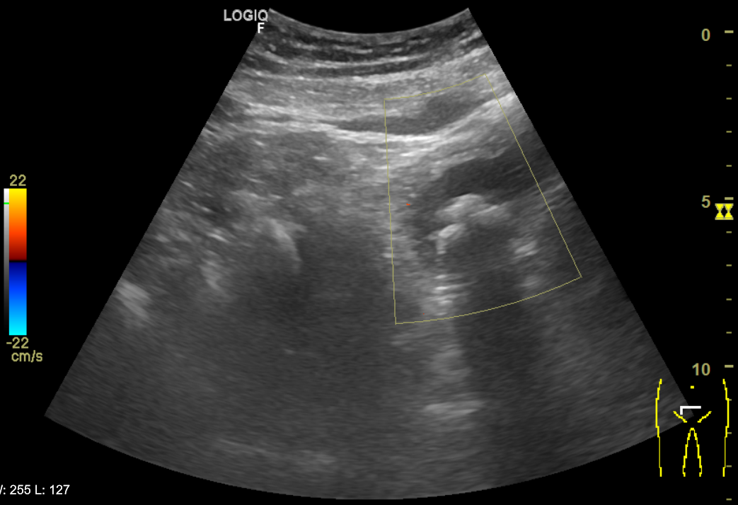 Riñones de morfología y tamaño normales. No se aprecian colecciones intrarrenales ni perirrenales. Sin ectasia de sistemas excretores. Quiste cortical simple en polo superior de riñón izquierdo de 6x6cm. Vejiga poco replecionada de paredes uniformemente engrosadas y trabeculadas. Múltiples imágenes hiperecogénicas con ausencia de registro Doppler y con sombra posterior que sugiere cistolitiasis. Próstata de aspecto normal con volumen de 21 cc. Volumen premiccional de 89 cc y posmiccional de 11 cc.