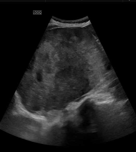 Presenta un buen estado general, piel normocoloreada, normohidratada y adecuada perfusión. Las constantes vitales normales. La auscultación cardiopulmonar sin alteraciones. A la palpación abdominal, masa de gran tamaño en el flanco derecho, de consistencia dura, aproximadamente de 10 cm, con leve dolor a la presión. No hay signos de irritación peritoneal ni defensa. Extremidades inferiores libres de edemas o indicios de trombosis venosa profunda.