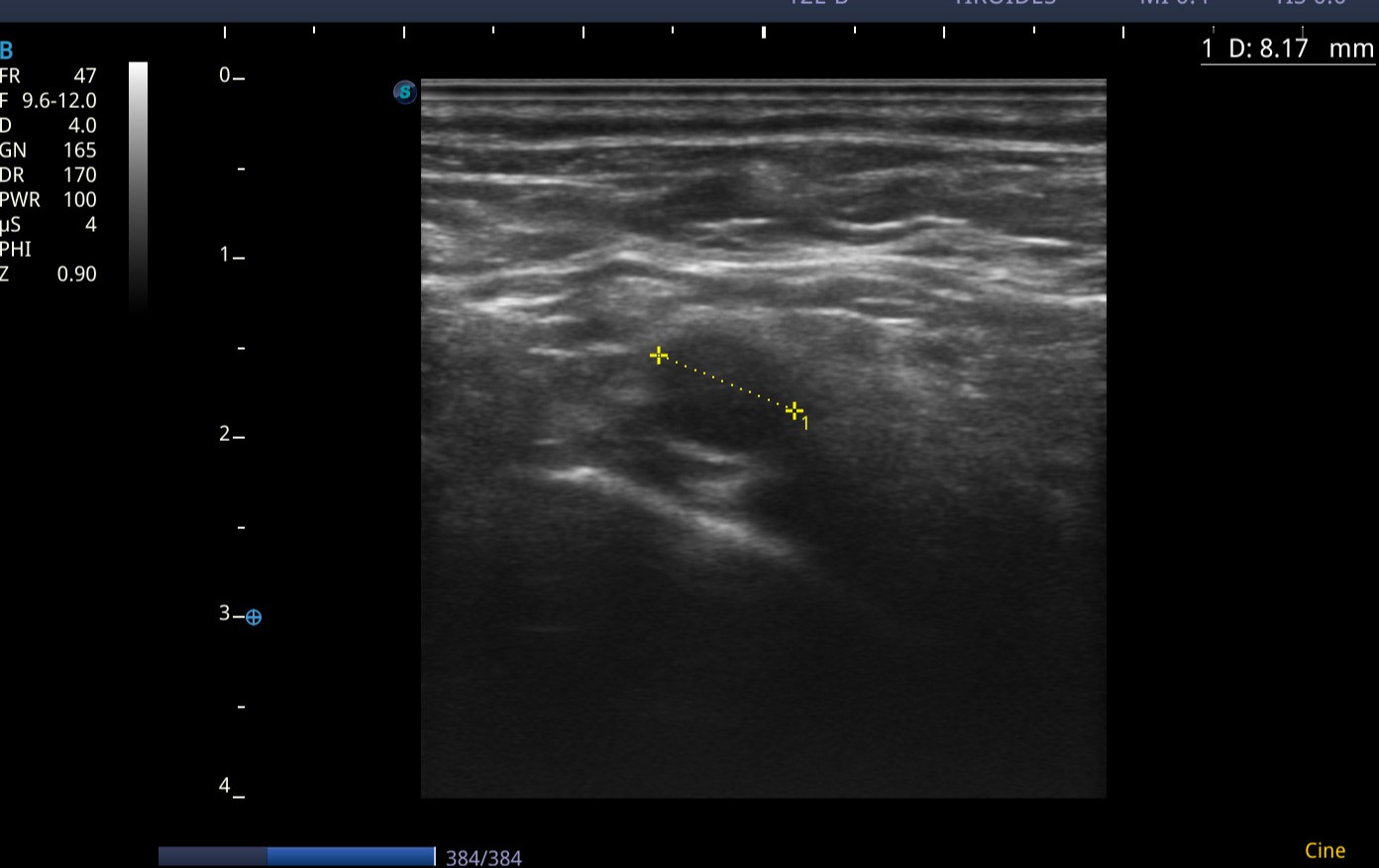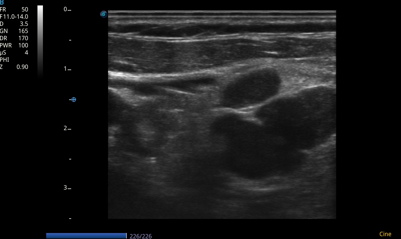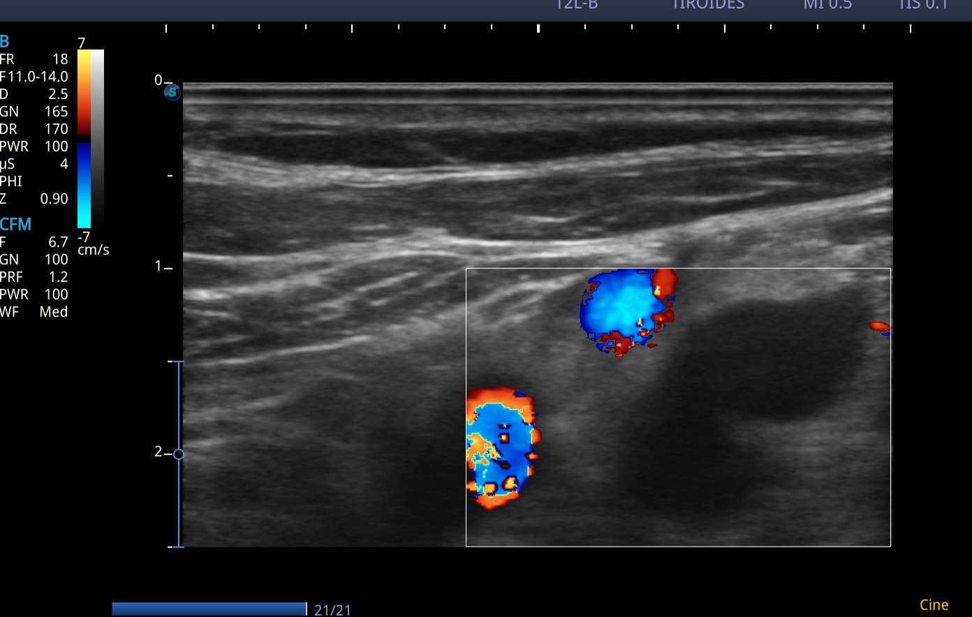 Conglomerado adenopático en cadena ganglionar laterocervical izquierda. Los ganglios visualizados presentan márgenes poco definidos/irregulares, ausencia de hilio ecogénico, ecogenicidad heterogénea, y algunos con forma redondeada, características con alta sospecha de malignidad. Dadas tales características y antecedentes personales, se deriva de forma preferente a Medicina Interna, para completar estudio de adenopatías.