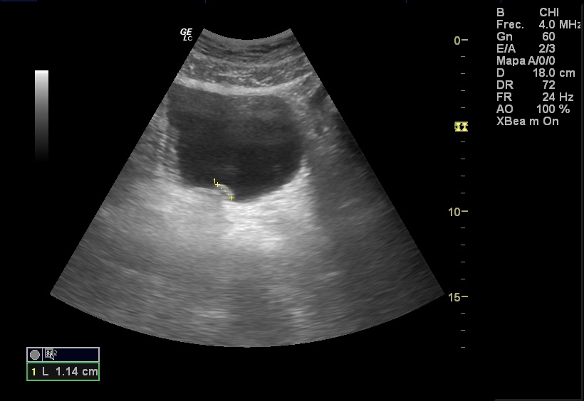 Ecografía abdominal y renal sin hallazgos. En la vejiga se aprecia una lesión polipoidea hiperecogénica irregular de bordes lobulados, de 1,23 cm de diámetro dependiente de la pared vesical en la región del trígono vesical.