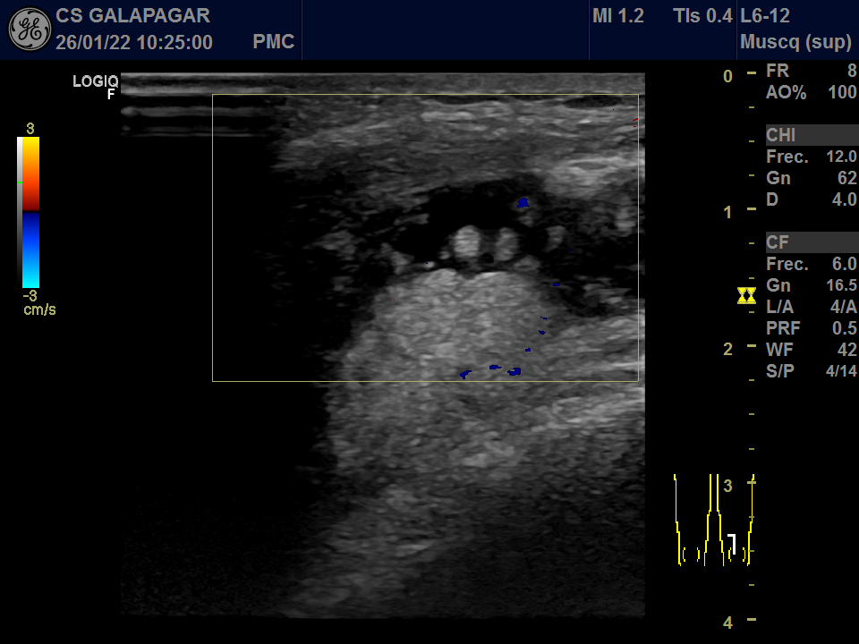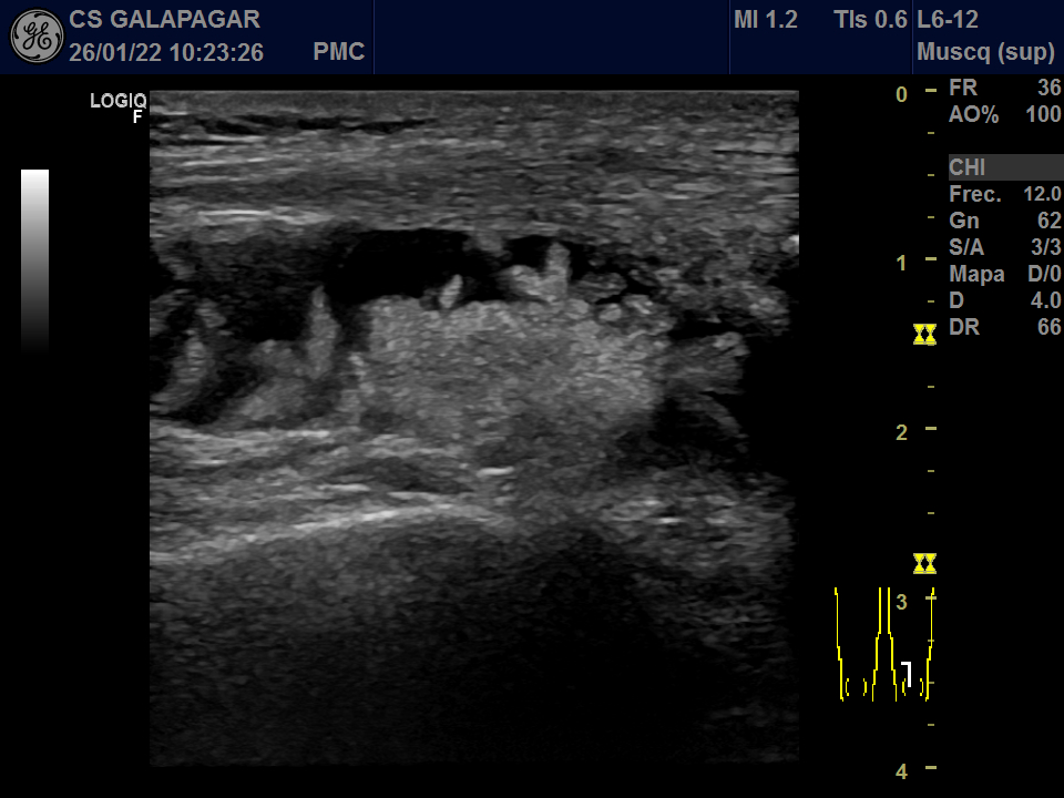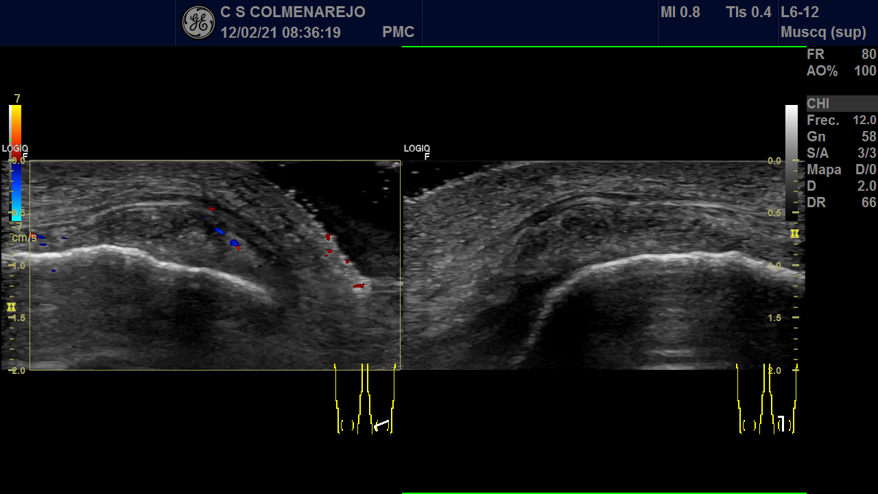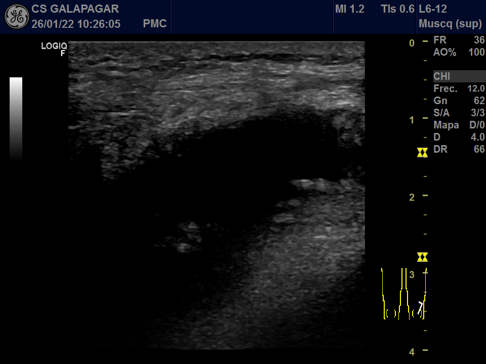 No RAMc. Alcohol ocasional. No fumador. No FRCV. AP: hiperuricemia con artritis gotosa. IQx: no refiere. Tto: no refiereEF: REG, consciente, normohidratado, normoperfundido. Afebril. Rodilla izquierda: No se observan lesiones dermatológicas, ni hematomas. No deformidad. No bostezo en varo/valgo. Maniobras meniscales negativas. Cajones ant-post negativos. Neurovascular distal conservado. Tumefacción con aumento de temperatura. Pie izquierdo: No dolor a la palpación en base de 5º metarsiano. Cajón ant-post negativo. Neurovascular distal conservado. Con la ecografía orientamos el diagnóstico diferencial.