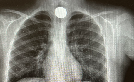 Se reinterroga a la niña, que acaba confesando la ingesta de una moneda de 2 euros por error, al estar jugando con ella. En ese momento, se decide realizar una radiografía de tórax, donde se visualiza una imagen radiopaca compatible, en la región anterior del mediastino, a nivel del tercio proximal del esófago.