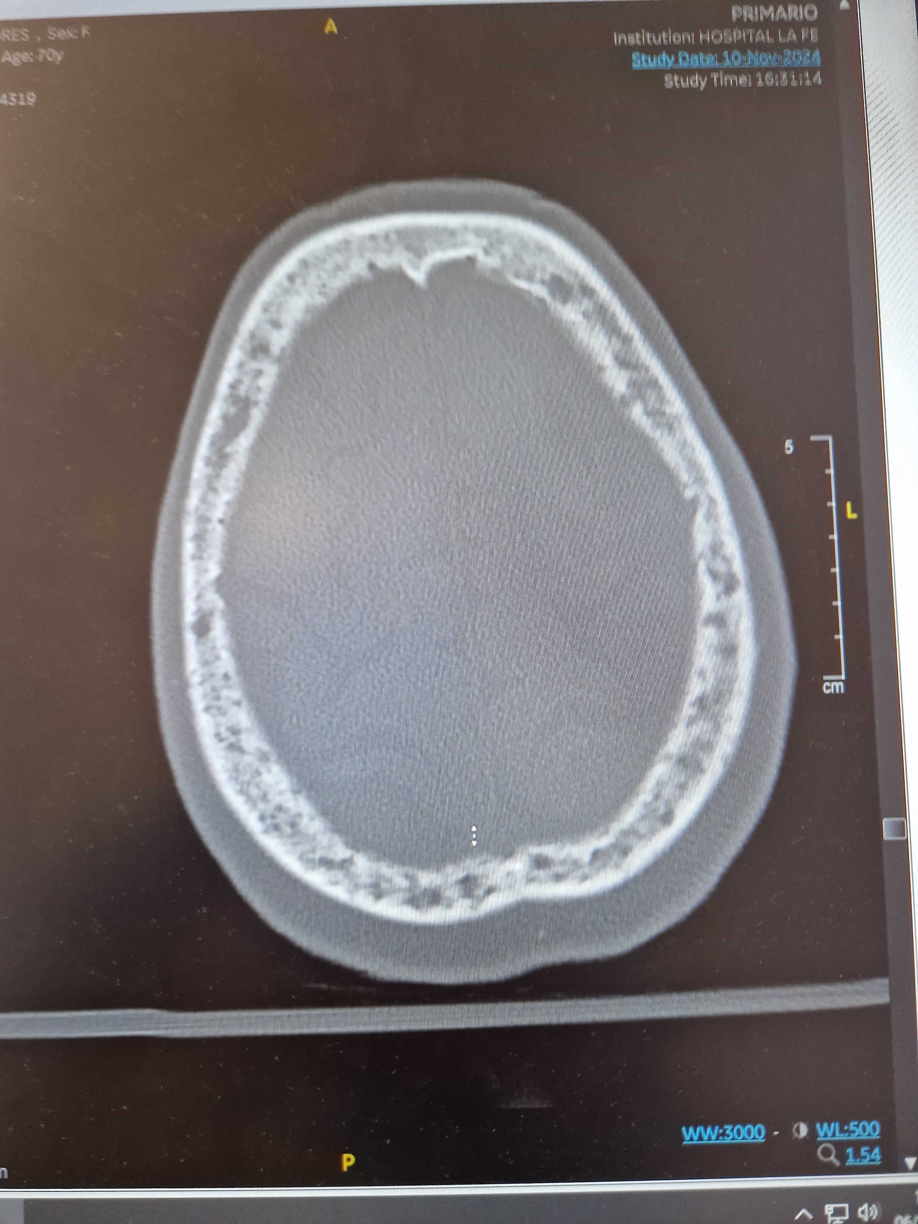 Tras realizar entrevista clínica a familiares destaca la rapidez de instauración de la clínica en menos de 24 horas, previamente la paciente se encontraba asintomática. Se decide realizar TAC para descartar lesiones cerebrales.