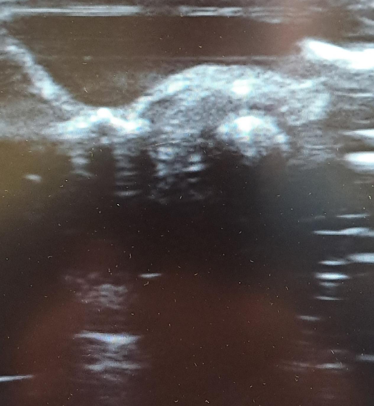 En la ecografía clínica se objetiva aumento de tamaño de la piel de aspecto nodular en región superior de la dermis objetivando una línea hiperecogénica sin sombra acústica posterior en región central de la lesión.
