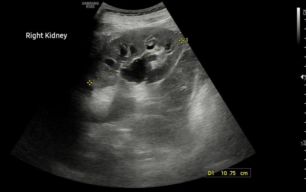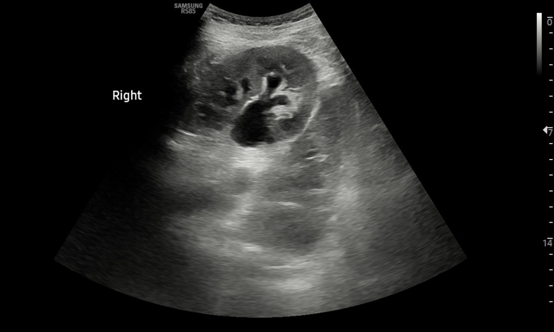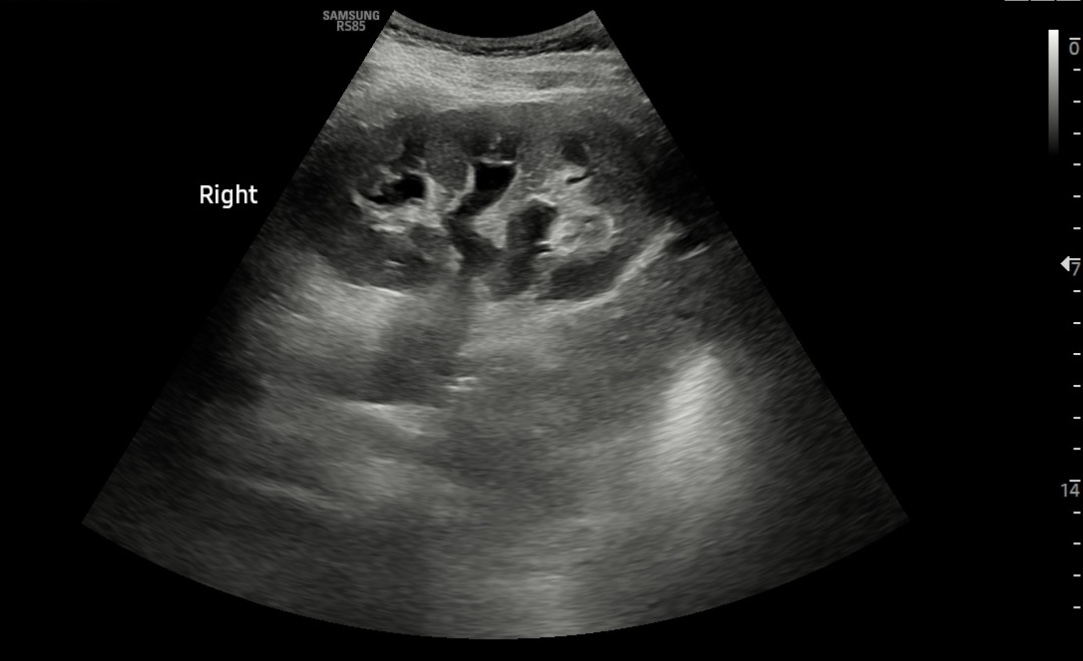 - Ambos riñones de tamaño y parénquima conservados. Objetivamos una hidronefrosis derecha grado 2. Parece apreciarse una imagen compatible con litiasis en uréter proximal y mínima cuña de líquido libre en polo inferior del riñón derecho.