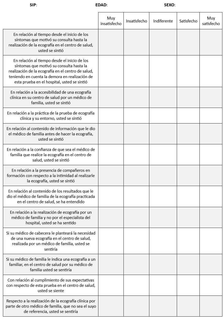 Analizar la perspectiva del paciente ante la realización de ecografía clínica en Atención Primaria por parte de una médica de familia en un área rural de la provincia de Alicante con >350.000 habitantes, mediante la cumplimentación de una encuesta (Imagen 1) por parte de los pacientes.