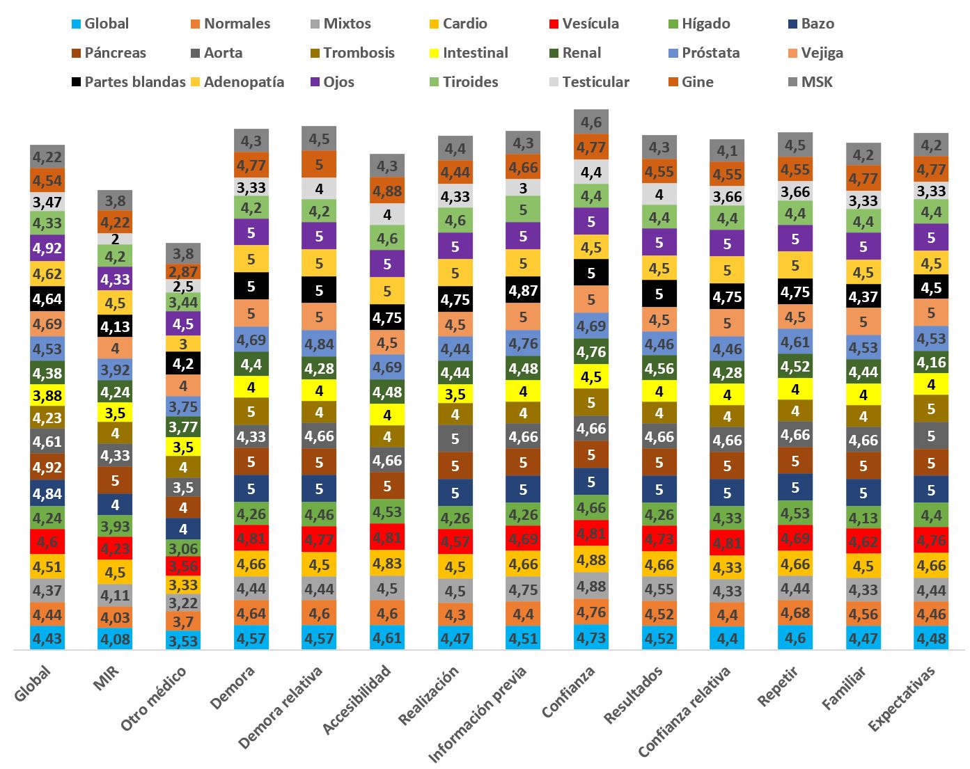 Variaciones a destacar según el área ecográfica sería (Imagen 3): mayor edad en pulmonar, cardiológico, pancreático y aórtico y menor en adenopatías y ginecológico; predominio femenino en tiroides y musculoesquelético y masculino en vesical, intestinal y mixto; satisfacción global menor en testicular e intestinal; mayor aceptación de residentes en cardiológica, renal y oftalmológica; menor en testicular; y de otro médico en testicular, ginecológica y hepática, mayor en partes blandas, oftalmológica y renal.