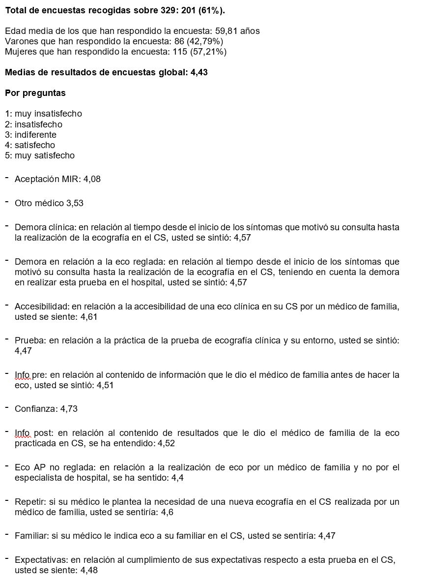 La aparente gran acogida de esta prueba por parte de los pacientes con una media global de satisfacción o mucha satisfacción, podría limitarse por la predominante recogida meses posteriores a la ecografía.