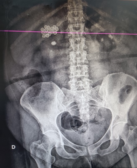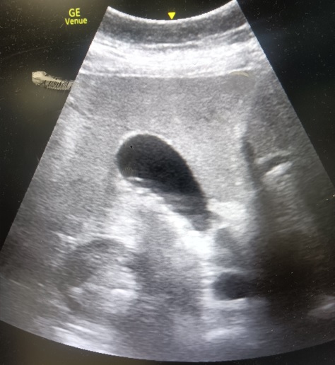 Se realiza ecografía clínica (POCUS) en la que se evidencia vesícula biliar con múltiples cálculos Murphy ecográfico positivo, vía biliar no dilatada. Además en riñón derecho se objetiva imagen cálcica de 1 cm con hidronefrosis grado II. No presenta líquido libre, aorta dentro de parámetros normales.