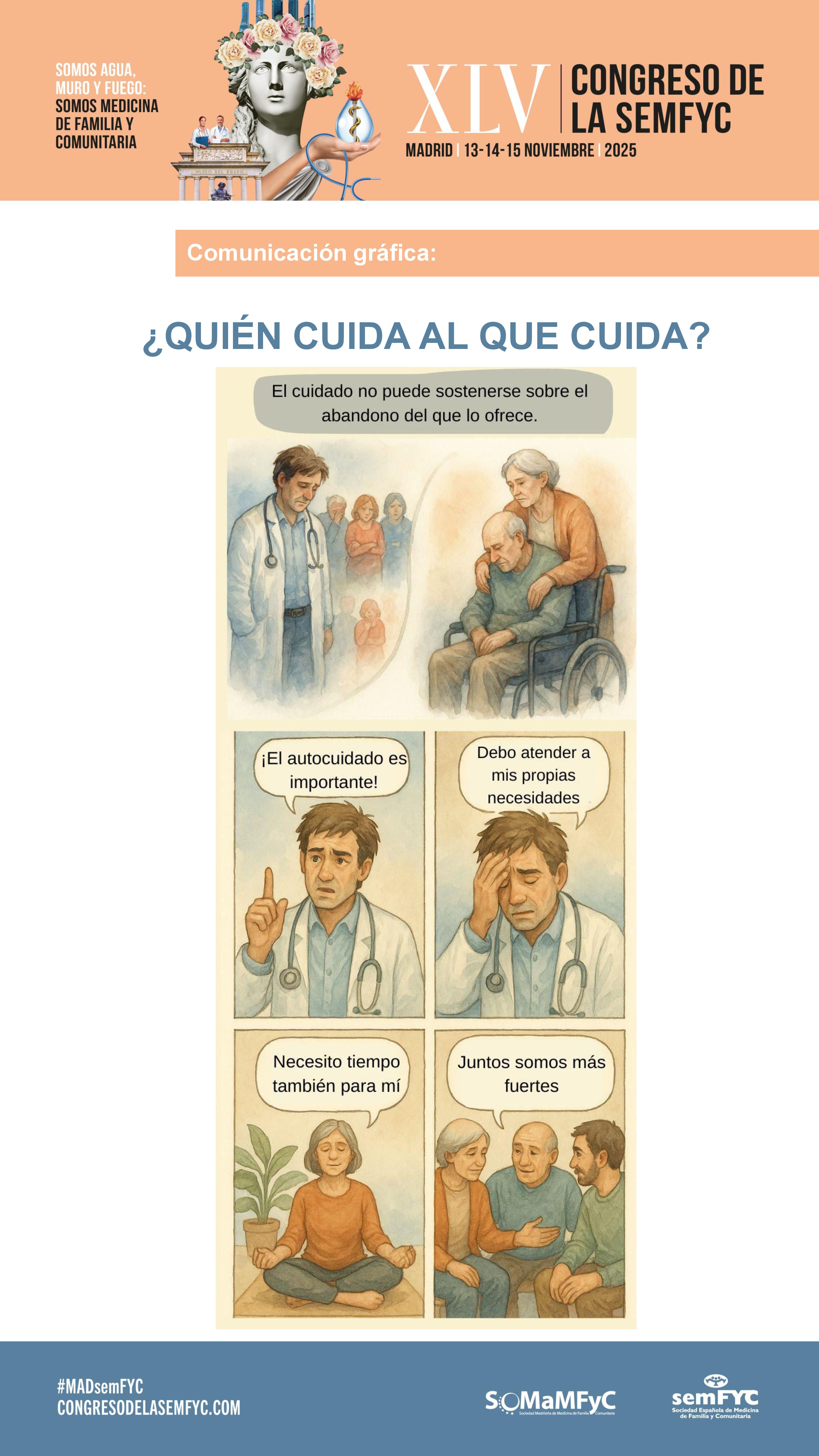 Esta comunicación busca promover el reconocimiento, la reflexión y la implementación de acciones que fortalezcan el cuidado integral de los cuidadores en todos los ámbitos, desde la práctica clínica hasta el entorno familiar. Además, apoyar la creación de programas de formación, apoyo psicológico y medidas de conciliación que favorezcan su salud y equilibrio.