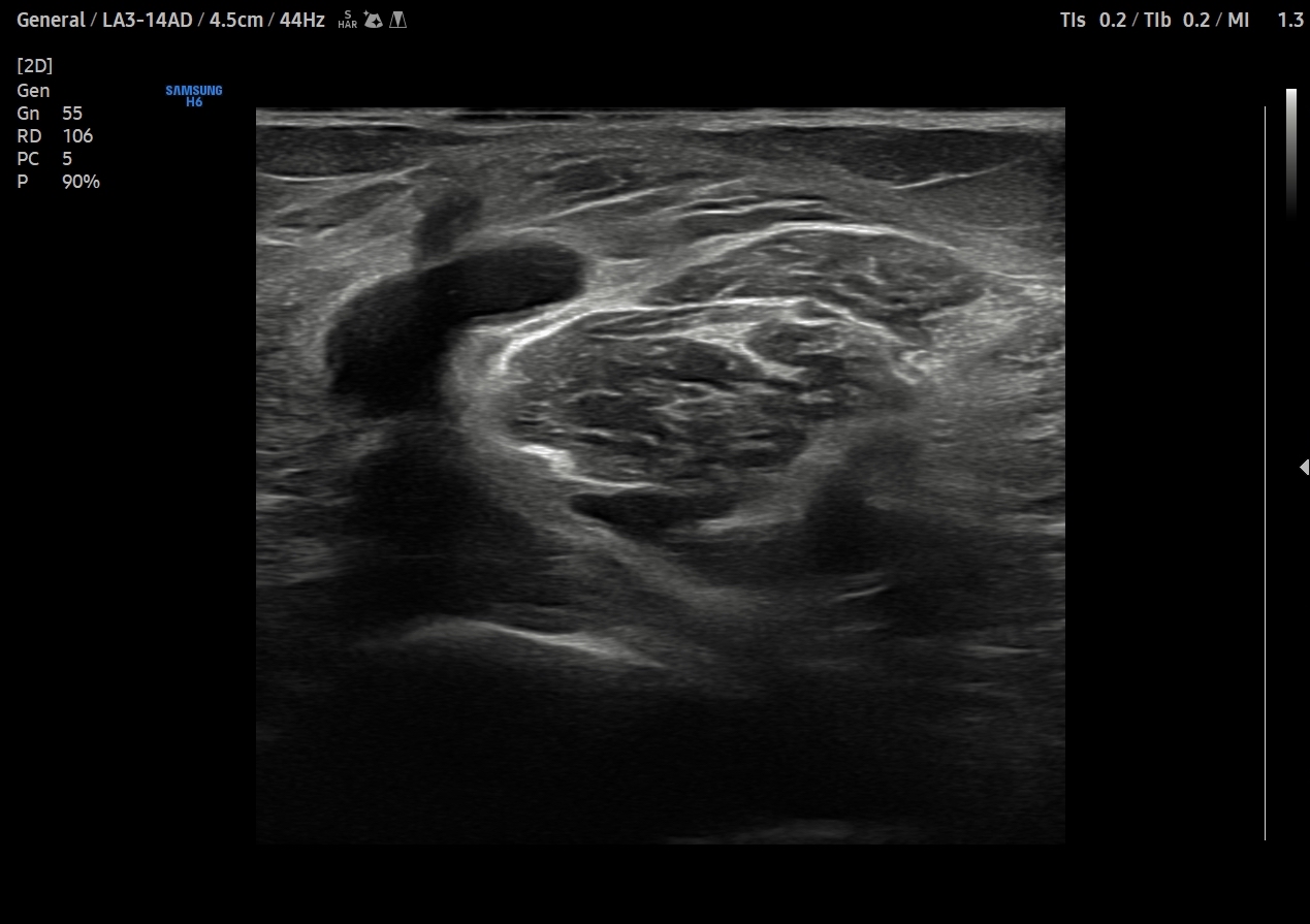Se explora cara anterior, lateral y medial de rodilla sin hallazgos significativos. En cara posterior se explora el hueco poplíteo donde se visualiza en corte transversal una estructura hipoecoica con la base, el cuello entre el tendón del semimembranoso y el tendón de la cabeza medial del gemelo interno y el cuerpo. Sin signos de complicación. Permeabilidad del sistema venoso profundo.