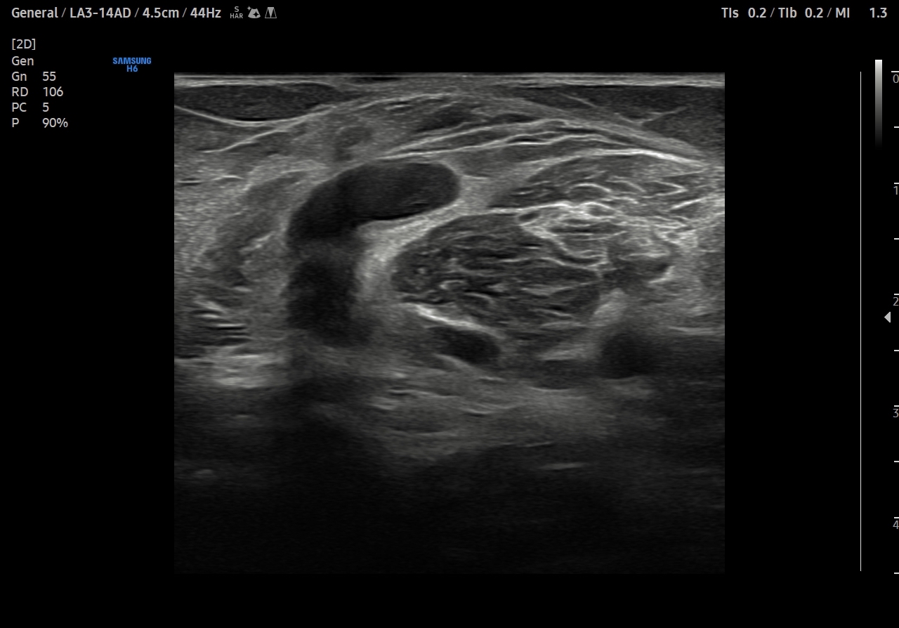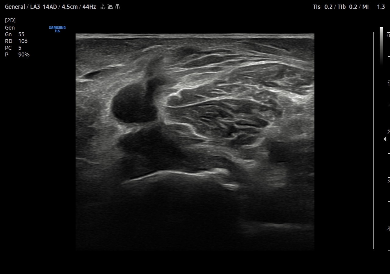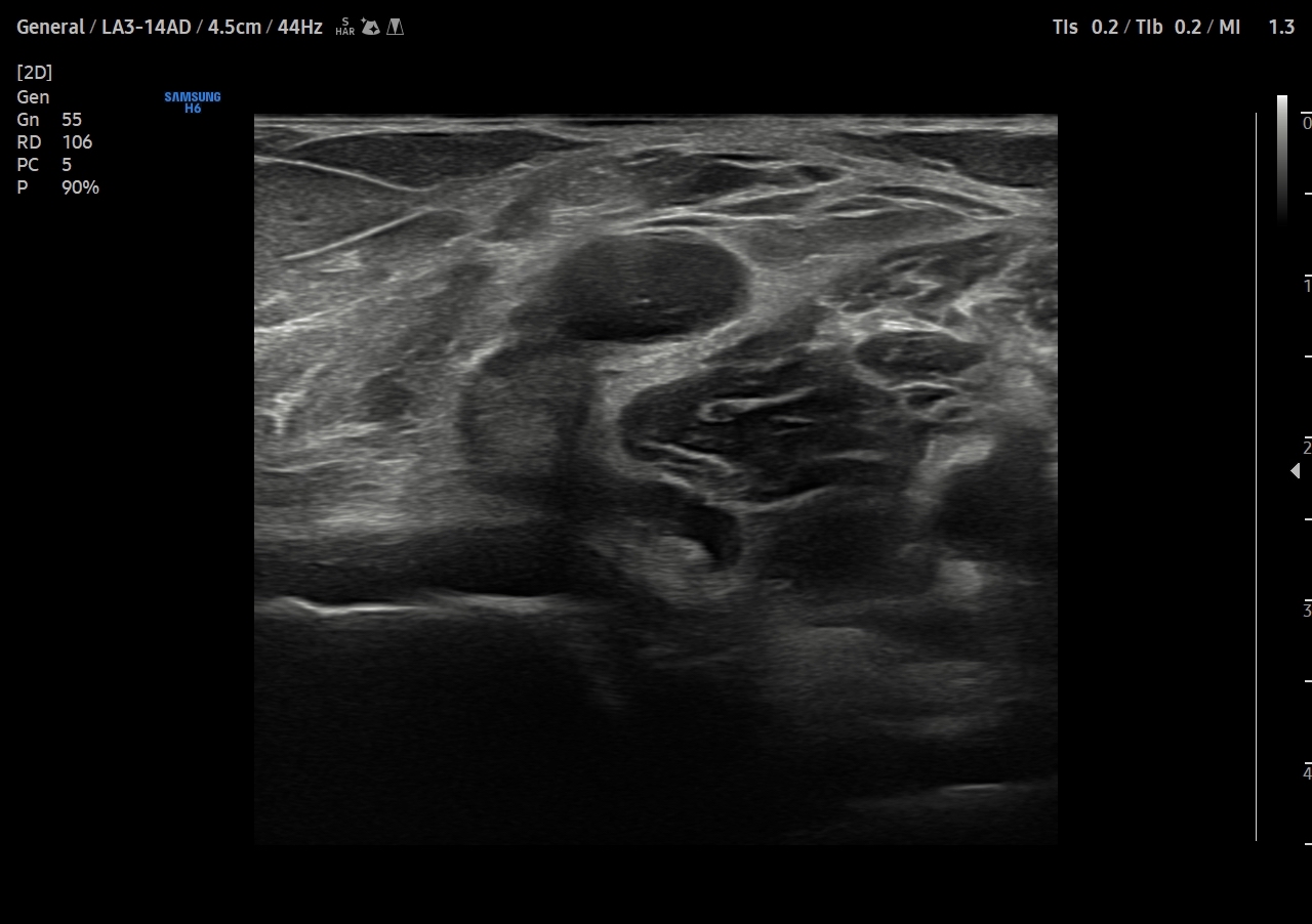 Paciente de 62 años, sin alergias medicamentosas conocidas. Hipertensa y dislipémica. Gonartrosis bilateral, hipotiroidismo. Tratamiento previo: Levotiroxina 25 mcg, Vortioxetina 5 mg Atorvastatina 10 mg, Omeprazol 20 mg, Paracetamol 1 g y Enalapril/Hidroclorotiazida 20 mg/12,5 mg. Acude por dolor en rodilla derecha que irradia hacia gemelo desde hace un mes, a raíz de caída en la calle. Fue vista en Urgencias del centro de salud en varias ocasiones persistiendo el dolor pese a tratamiento médico. Exploración física: rodilla derecha sin tumefacción. No peloteo rotuliano. No dolor a la palpación de puntos óseos. No dolor en trayecto de ligamentos colaterales. Dolor a la palpación en interlínea articular interna y dolor a la palpación de cara posterior de rodilla. Limitación para flexión completa de rodilla derecha respecto a contralateral. Realizamos ecografía clínica de rodilla derecha.