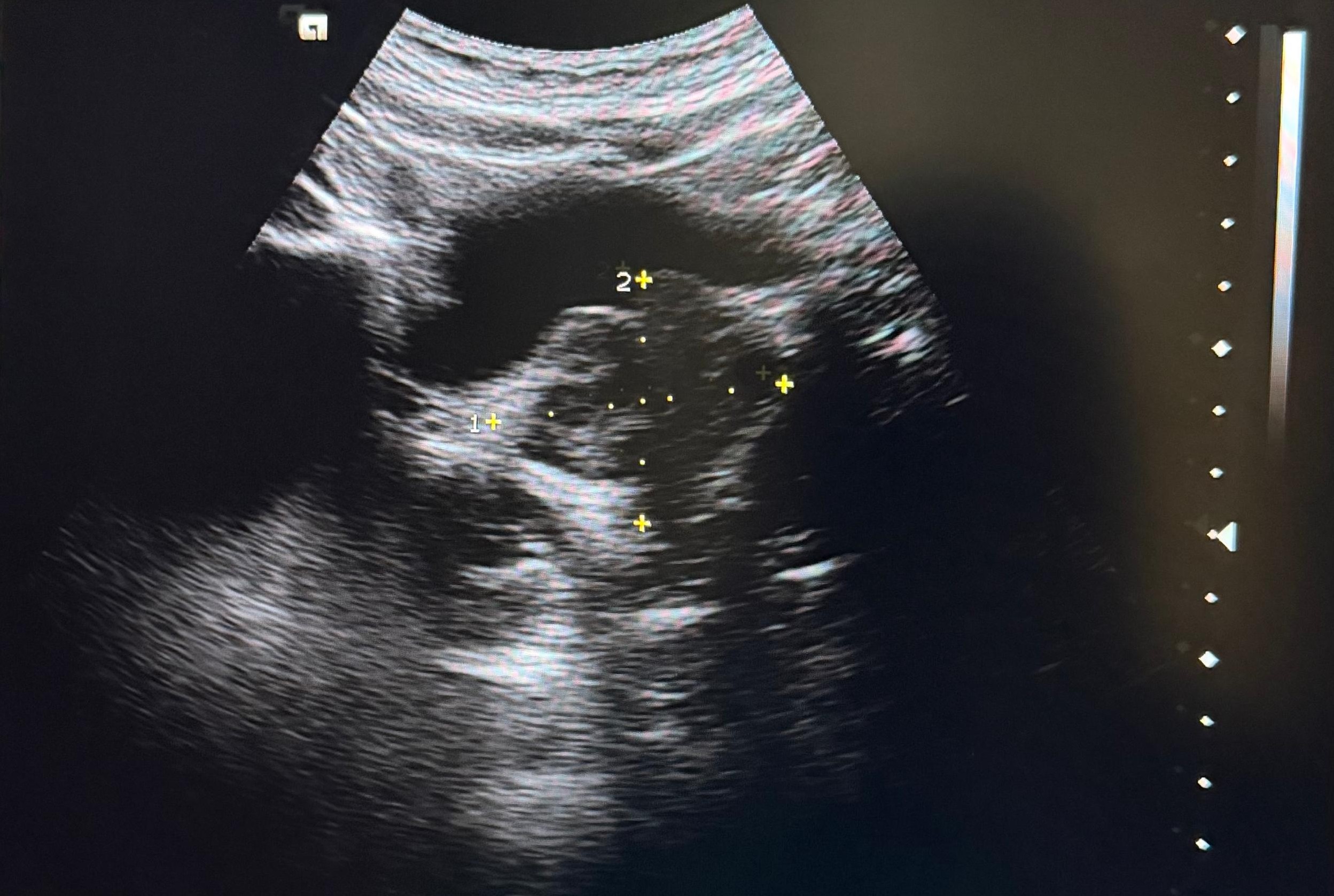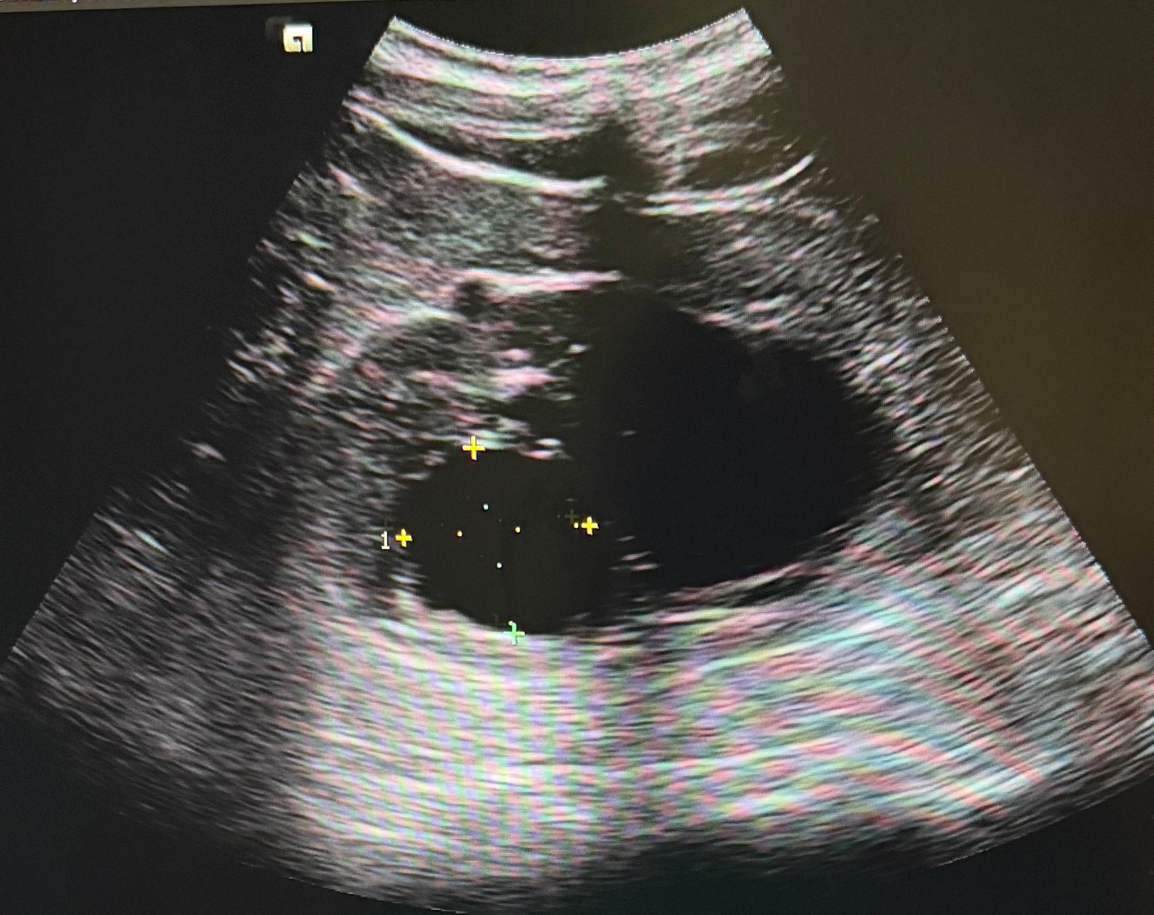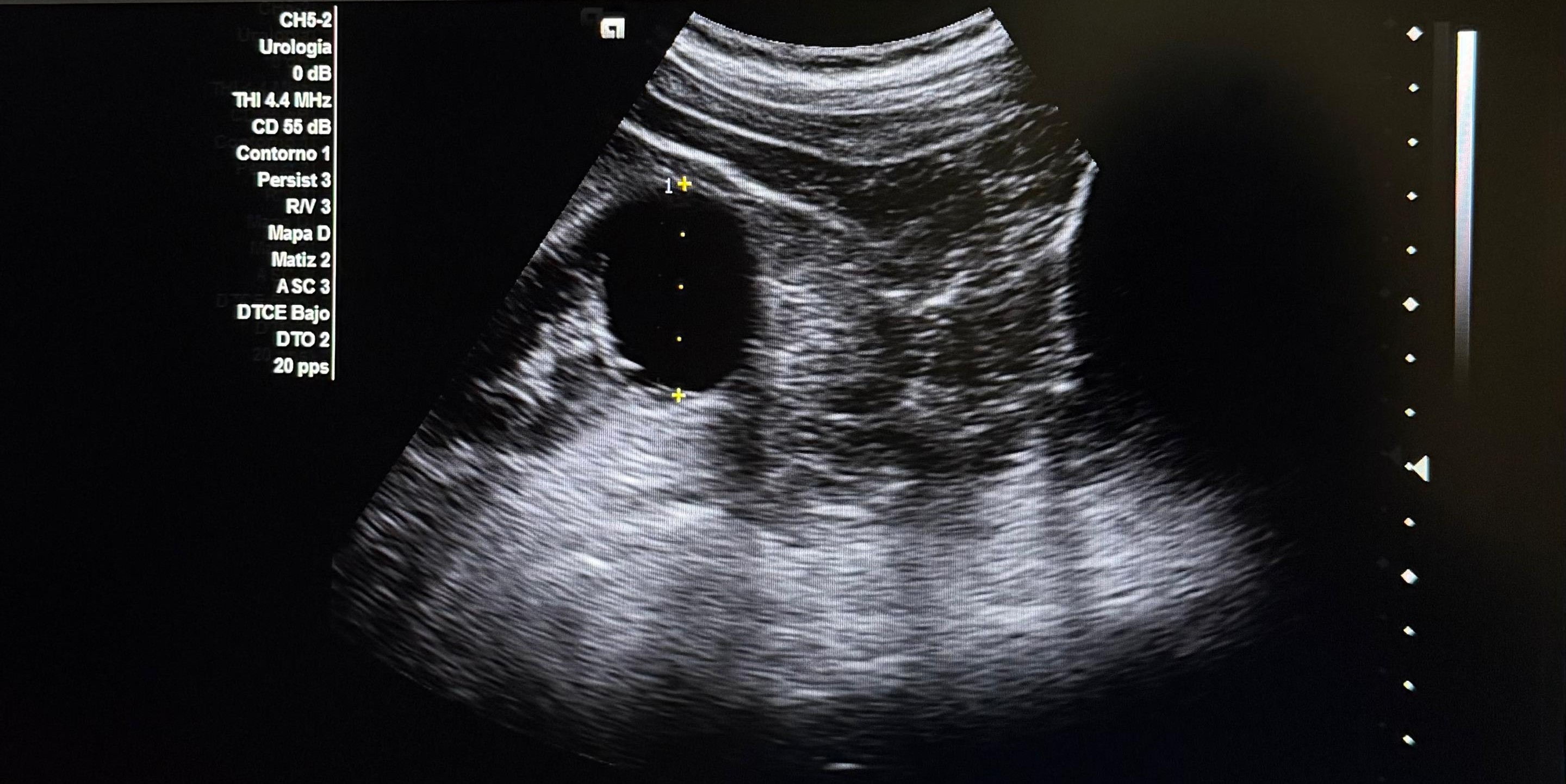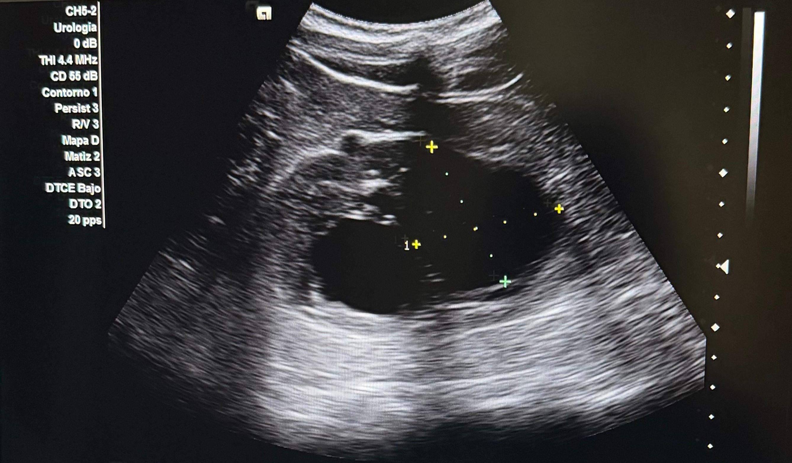Se realiza ecografía abdominopélvica donde se visualiza vejiga sin alteraciones, próstata aumentada de tamaño con un volumen estimado de 59 cc. Como hallazgo incidental se objetivan ambos riñones aumentados de tamaño con varios quistes.