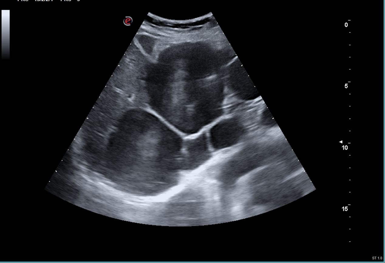 Ecografía: Hígado aumentado de tamaño con presencia de múltiples quistes simples (> 8), algunos de ellos tabicados, el mayor de 62 mm, con presencia de imagen heterogénea calcificada sin vascularización central ni periférica en lóbulo hepático derecho, segmento V-VI de 34 mm. Páncreas parcialmente visualizado sin lesiones. Riñón derecho con presencia de quiste cortical simple de 52 mm, sin otras lesiones, sin ectasia. Riñón izquierdo de tamaño y morfología normal sin lesiones, sin ectasia. Bazo sin alteraciones de tamaño normal. Vejiga adecuadamente replecionada con paredes levemente engrosadas, residuo postmiccional 30 ml.