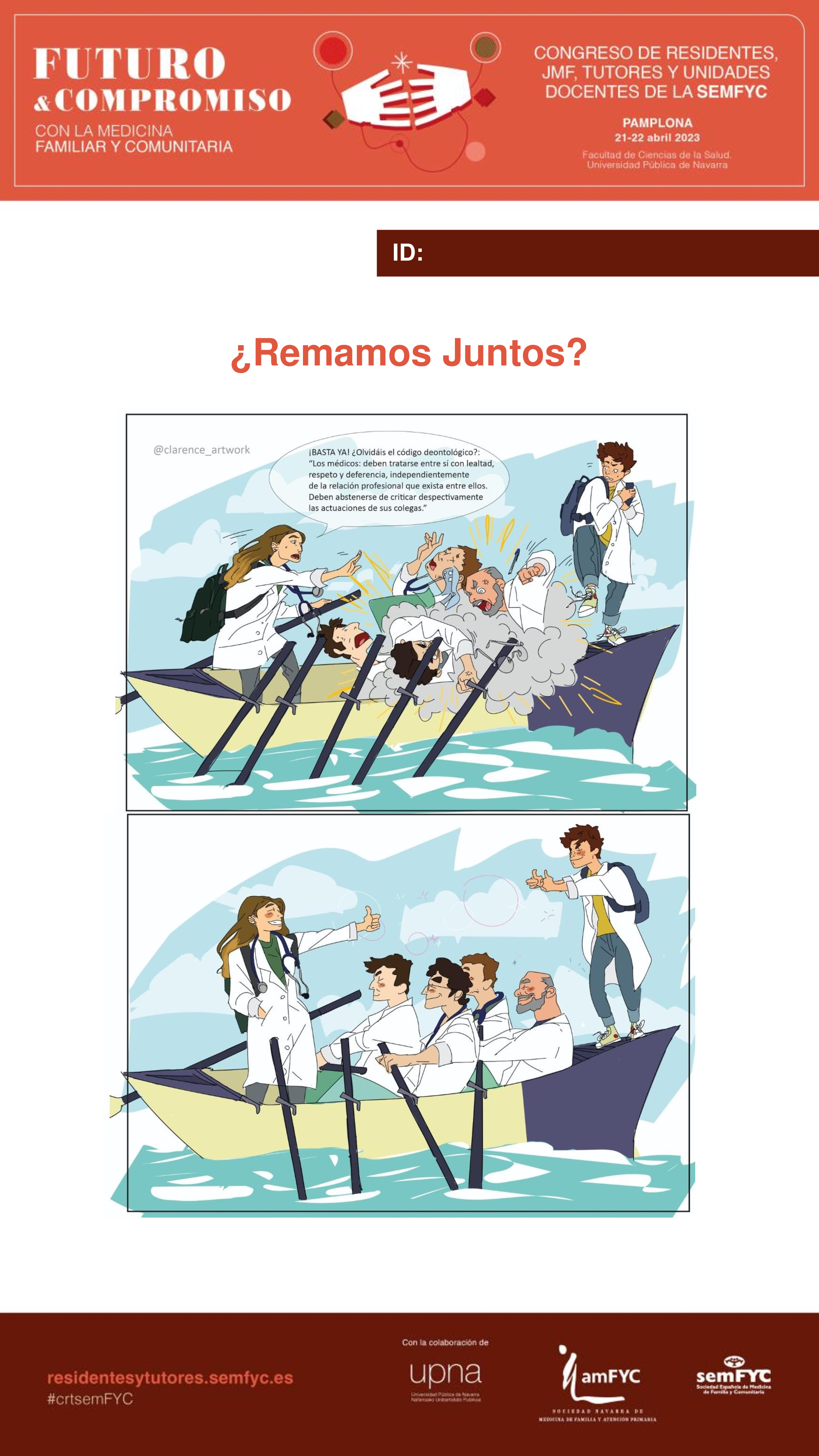 En un mar de trabajo, se encuentra un grupo de médicos en una pequeña embarcación, entre ellos 2 médicos jóvenes con mochila que representan al MIR que inicia su especialidad y que observan desde la periferia el conflicto y pelea de los médicos, entre miedos por la inestabilidad y el posible hundimiento de la embarcación, uno de los MIR grita y les recuerda el capítulo del código deontológico médico, que trata de la relación de los médicos entre sí. En la posterior viñeta se encuentra el mismo grupo, que ha tomado conciencia de la situación y van remando juntos.