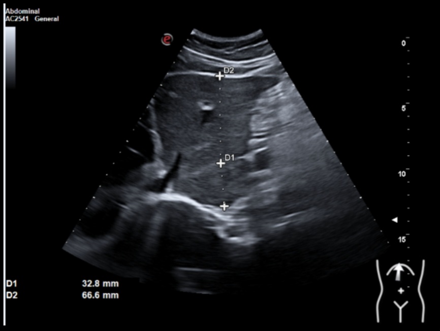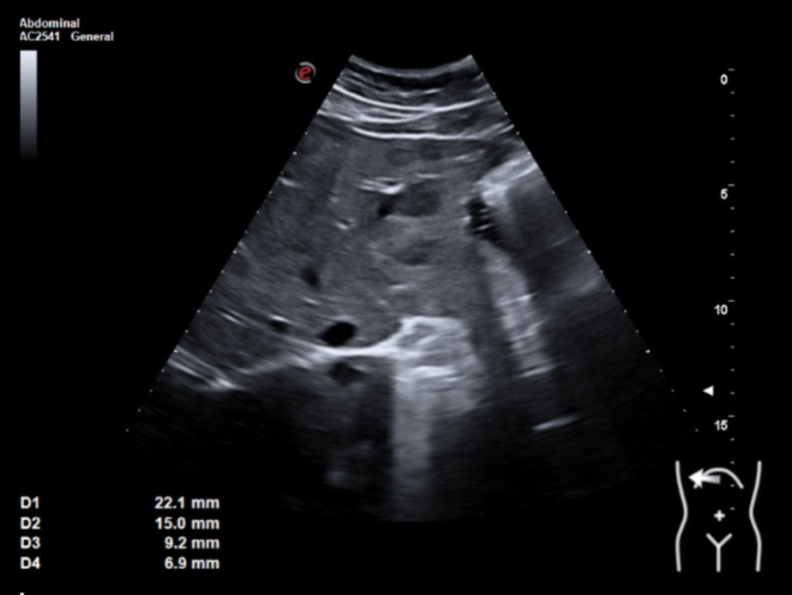 Ecografía clínica: múltiples lesiones en parénquima hepático bien delimitadas de hasta 2 cm, hipoecogénicas, en ambos lóbulos. Tamaño normal del hígado (15 cm) pero bordes obtusos. Vía biliar no dilatada. Vesícula alitiásica. Porta de calibre normal. Área pancreática no visualizada por gas intestinal. Ambos riñones normales. Vejiga vacía, no valorable.