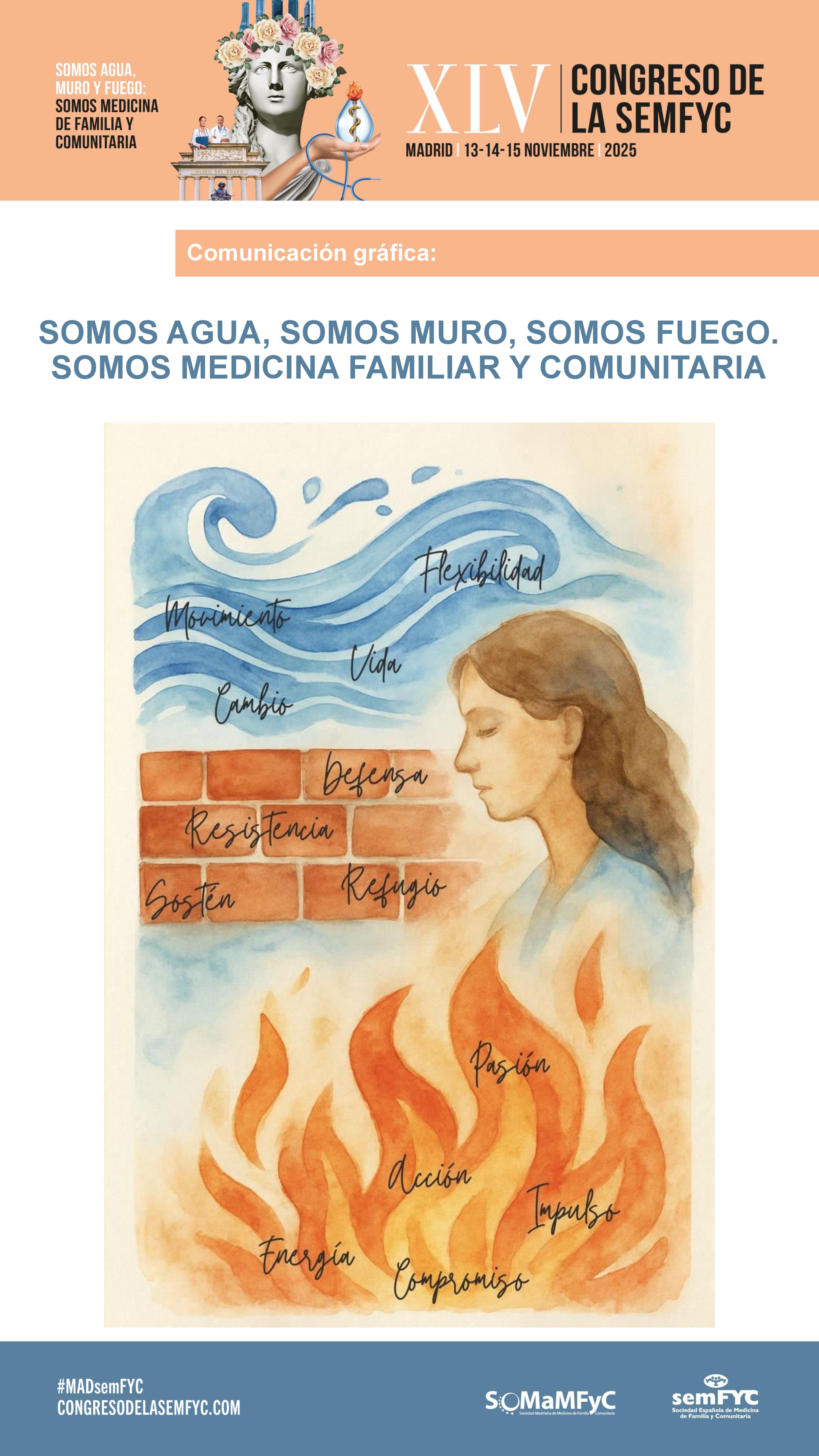 La medicina de familia constituye uno de los pilares del sistema sanitario, desempeñando un papel multifacético que puede ser simbolizado a través de los elementos agua, muro y fuego. Somos el agua que fluye, adaptándose a las necesidades del paciente y la comunidad; el muro que protege, construyendo barreras frente a enfermedades y desigualdades; y el fuego que motiva el cambio y la innovación en la Atención Primaria. Esta comunicación gráfica busca reflejar esta metáfora visualmente, poniendo en valor el papel integral y dinámico que desempeñamos en el cuidado de la salud.