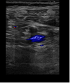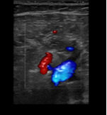 Ecografía diagnóstica Doppler de confirmación en hospital: trombosis venosa profunda poplítea derecha.