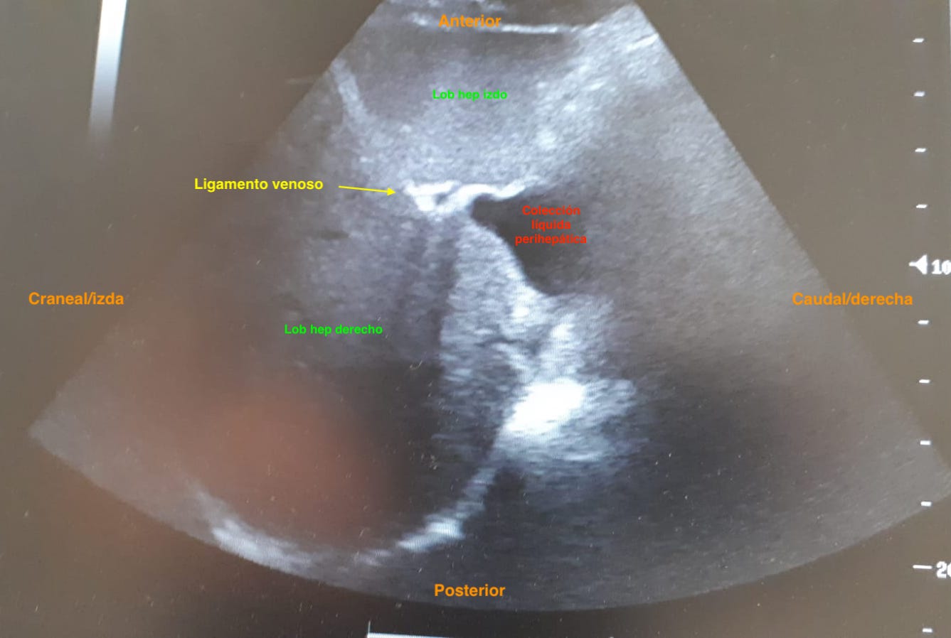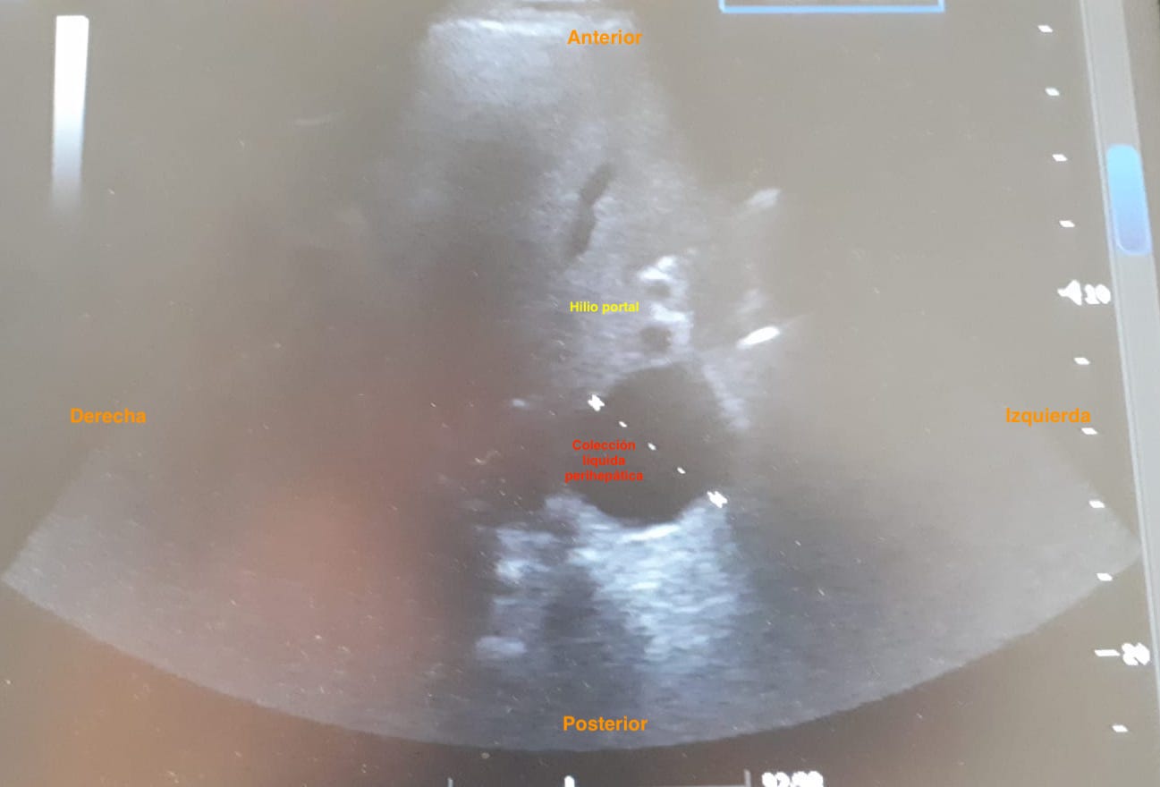 Colección líquida bien definida localizada posteriormente a lóbulo hepático izquierdo, adyacente a vena cava. Líquido peritoneal en fosa ilíaca derecha y flanco derecho, a nivel inferolateral de RD, espacio de Morrison conservado. Cantidad moderada de líquido en la pelvis.