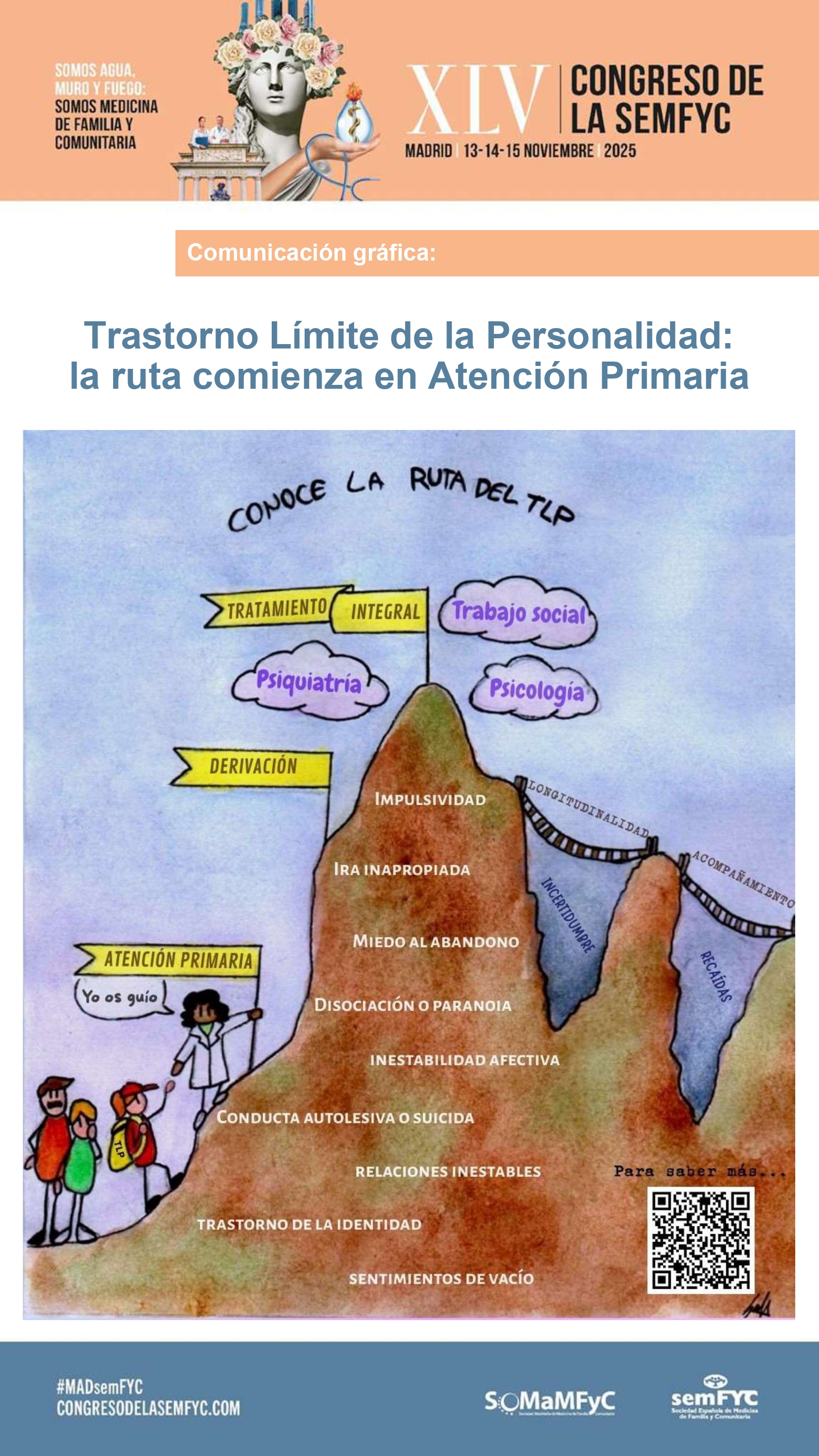 La imagen muestra una ruta montañosa para representar la complejidad del TLP. En la base, «Atención Primaria»: una médica dice «Yo os guío», destacando la importancia de la acogida a pacientes y familiares. La montaña principal expone los 9 criterios diagnósticos del TLP según el DSM 5-TR: impulsividad, ira inapropiada, miedo al abandono, disociación o paranoia, inestabilidad afectiva, conducta autolesiva o suicida, relaciones inestables, trastorno de la identidad y sentimientos de vacío (se deben cumplir al menos 5). Una bandera amarilla de «Derivación» marca el siguiente paso en la ruta. En la cima, la bandera «Tratamiento Integral» está rodeada de nubes: «Trabajo social», «Psiquiatría» y «Psicología», simbolizando el abordaje multidisciplinario. La ruta continúa a través de cimas unidas con puentes colgantes, representando «Longitudinalidad» y el «Acompañamiento» que intentan evitar la «incertidumbre» y las «recaídas» representadas como profundos valles.