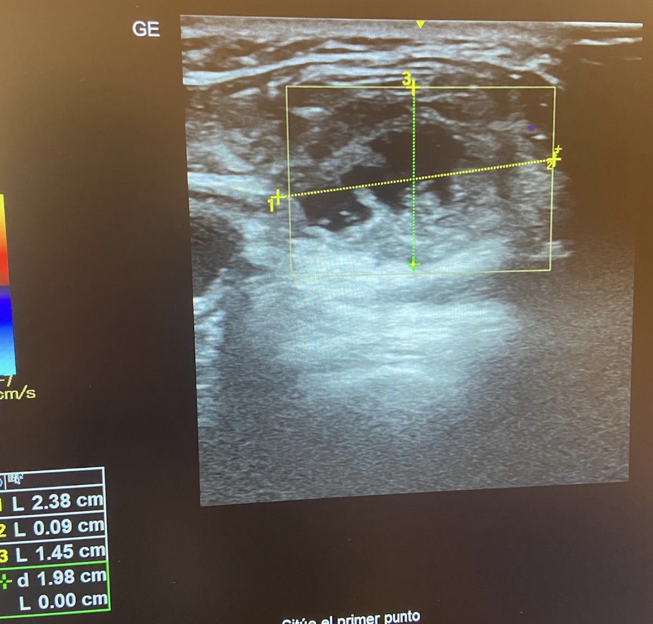 - Ecografía clínica: En tiroides dos imágenes a nivel de istmo/Lóbulo derecho tipo coloide (0,25 - 0,29) cm. Imagen de 2,38 x 1,45 cm bien delimitado, redondeada, con interior heterogéneo (hipo/hiper/anecoico). Doppler negativo.