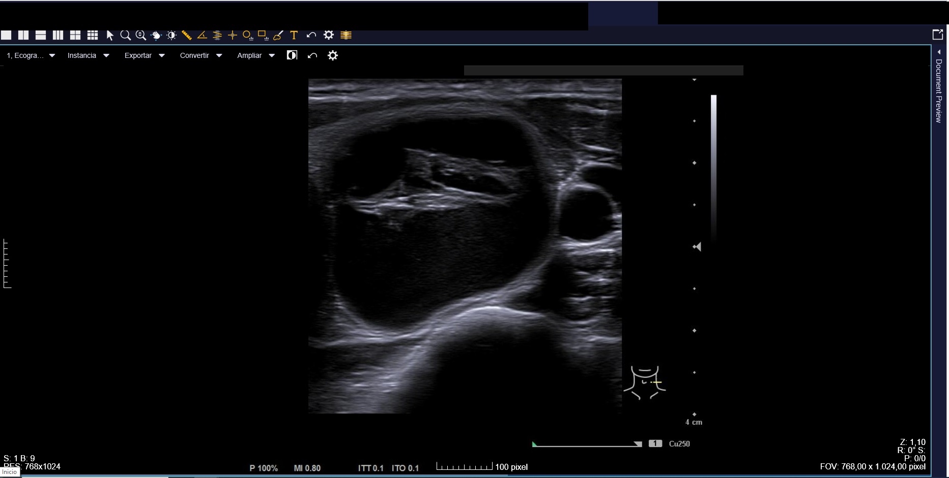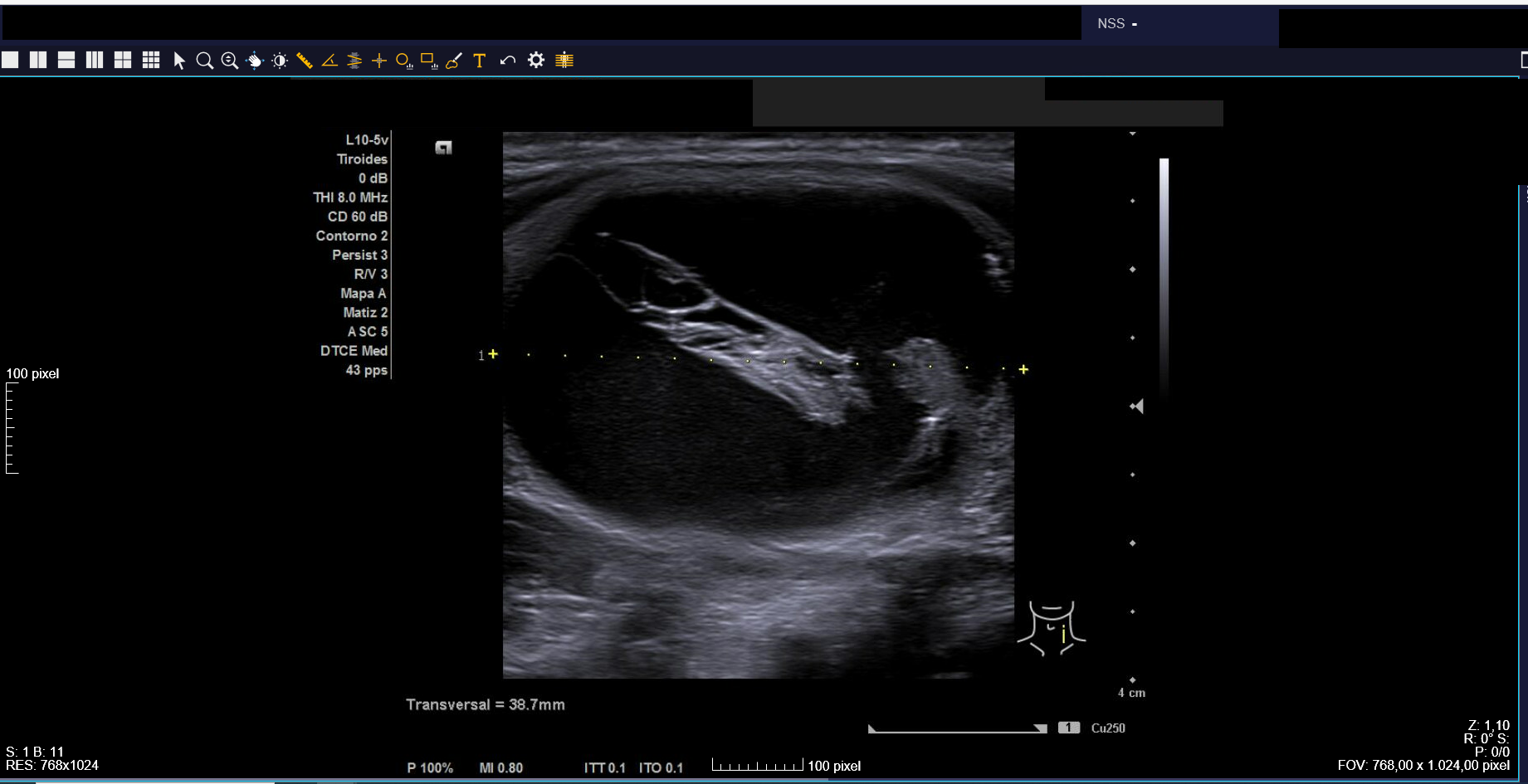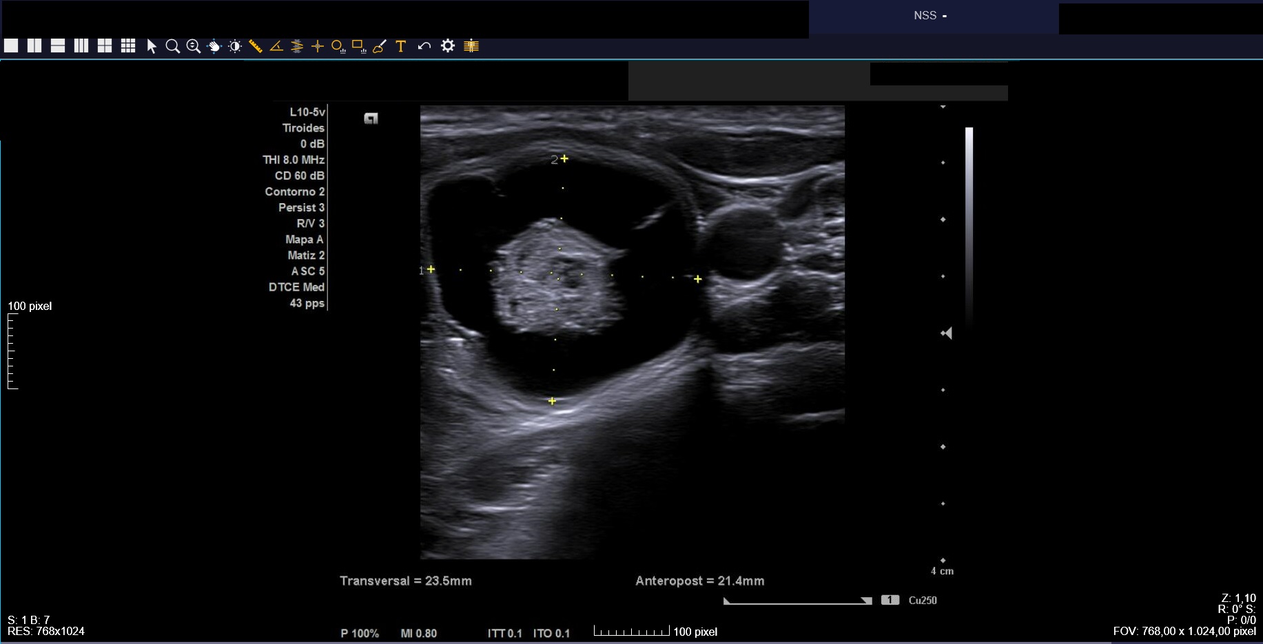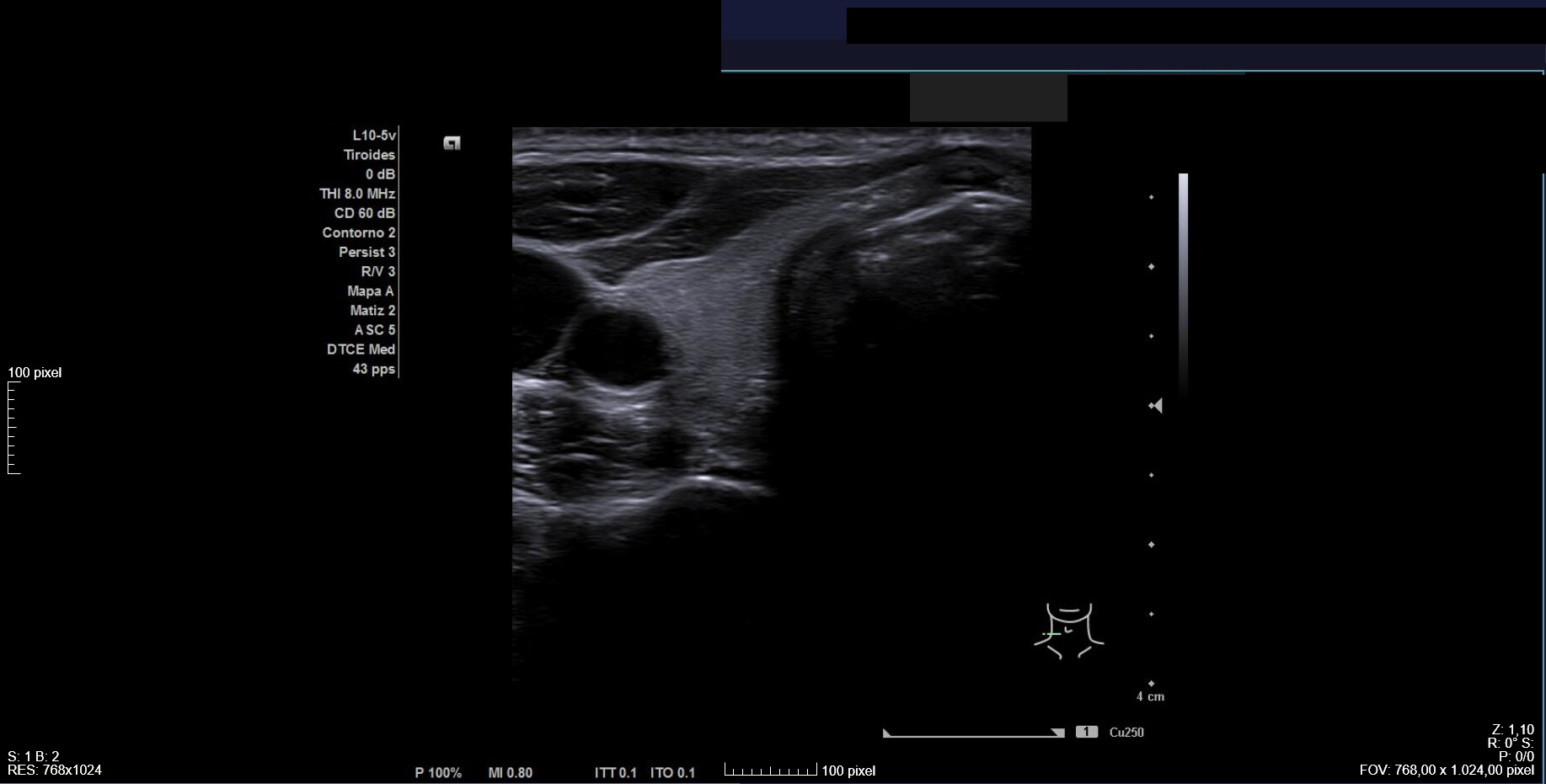 Ecografía clínica: tiroides de tamaño normal con ecoestructura homogénea. En lóbulo tiroideo izquierdo nódulo de 3 cm, anecoico, márgenes bien definidos con imagen hiperecoica en su interior (Imágenes 1, 2 y 3).