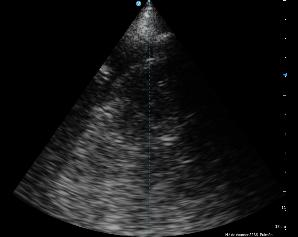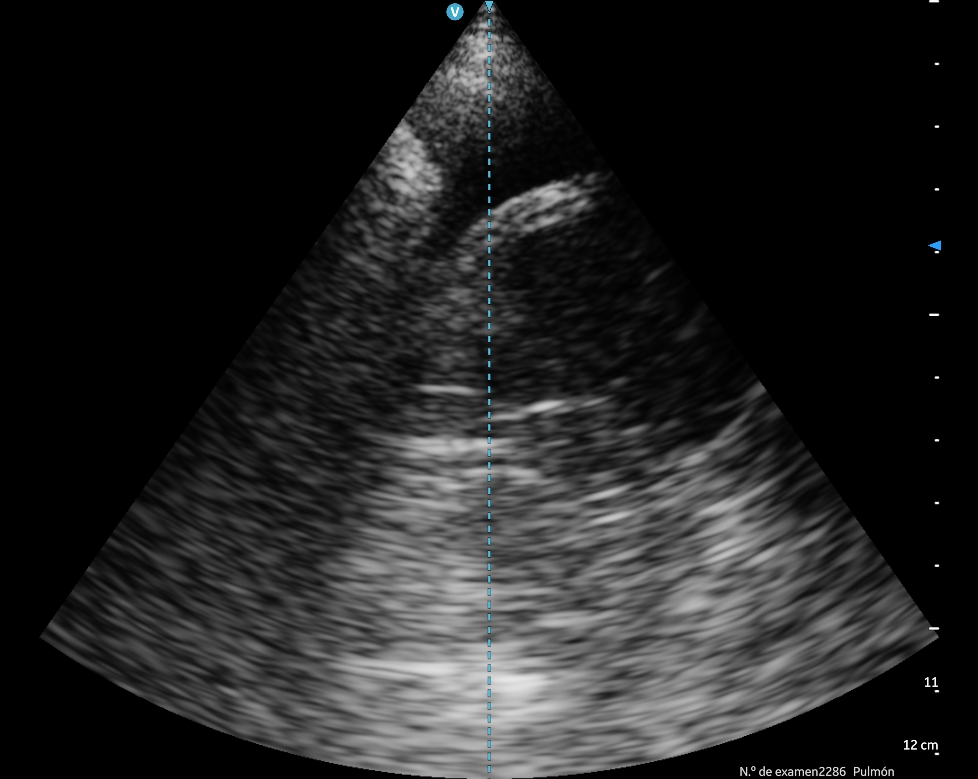 Antecedente de EPOC secundario a tabaquismo, consulta por cuadro clínico de disnea, tos con aumento de expectoración, fiebre de 38.5°C y mareo. Hace 7 días dolor en pecho, no irradiado, sin vegetativos. Al ingreso taquicárdica, taquipnéica y febril. Murmullo vesicular presente con leve hipoventilación en base pulmonar izquierda, roncus bilaterales. Se hace ecografía pulmonar ante sospecha de neumonía también en lóbulo inferior derecho.