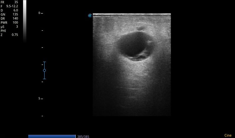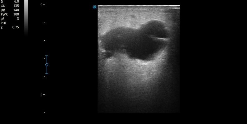 Ecografía MII: Sistema venoso profundo permeable, compresible en todo su recorrido, sin contenido hiperecogénico en su interior. Sistema venoso superficial permeable. Se objetiva a nivel de tejido celular subcutáneo de región interna de tercio superior de muslo izquierdo, colección anecoica, tabicada, no vascularizada, con algunos ecos en su interior, de unos 3-4 cm, con sombra acústica posterior. Importante edema en empedrado en pierna izquierda compatible con celulitis.